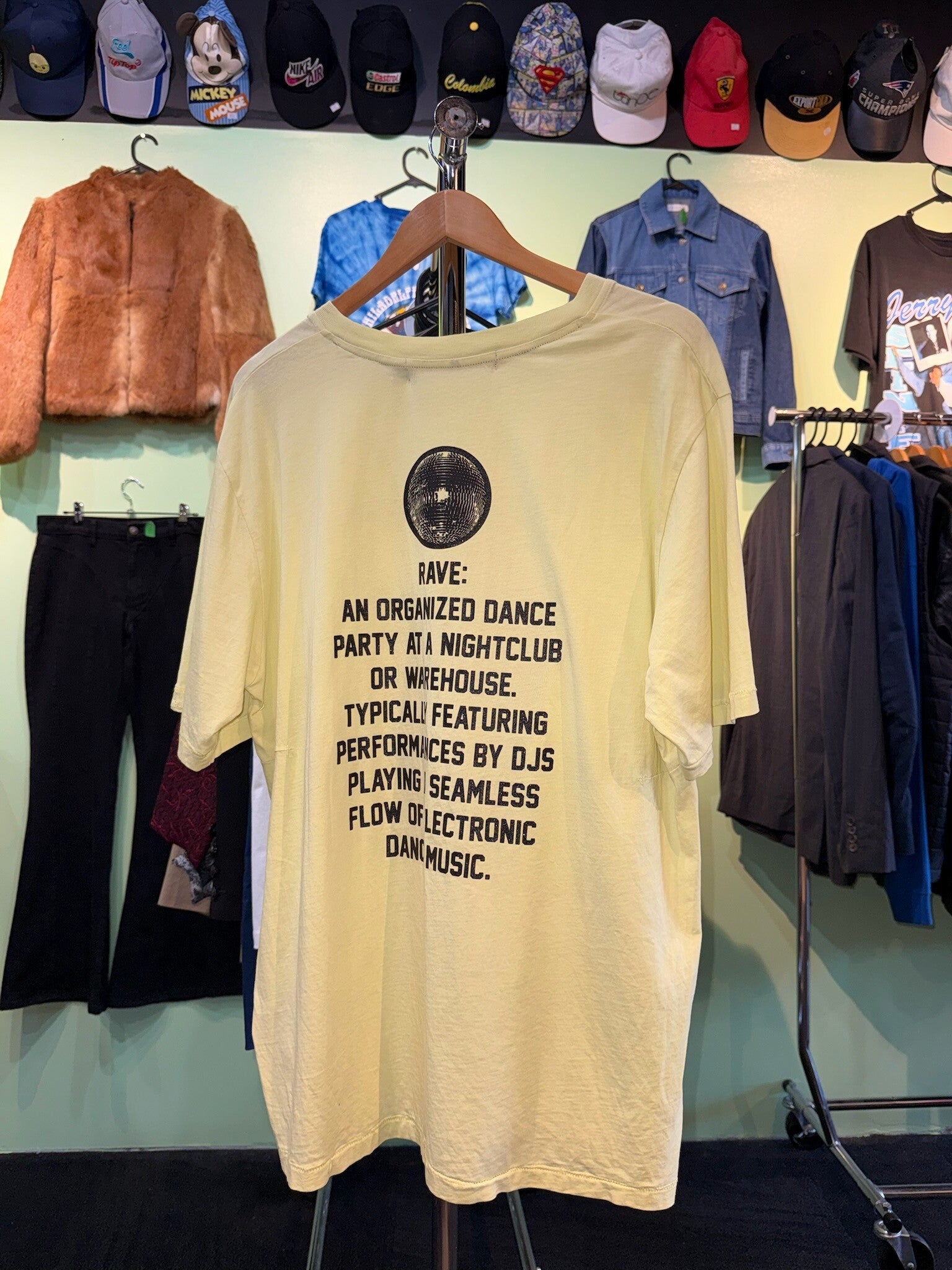 Turn heads with this bold yellow tee from Stolen Girlfriends Club, featuring double-sided glittered black graphics that scream 'Need More Rave.' With its unisex fit and vibrant design, this size XL shirt is a standout piece for any rave enthusiast or streetwear aficionado.
