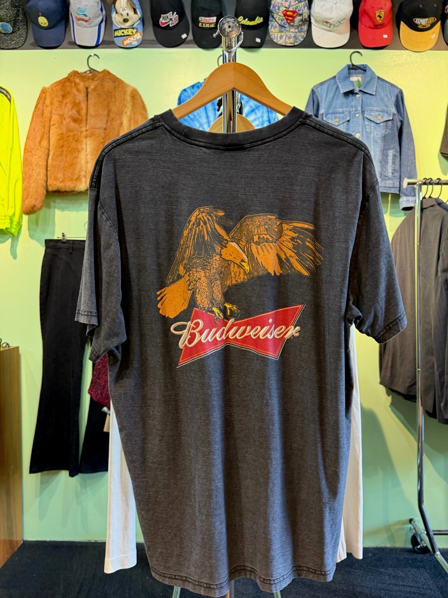 Vintage Budweiser tee featuring a small logo on the front and bold graphic on the back. Unisex & perfect for beer fans and vintage collectors.